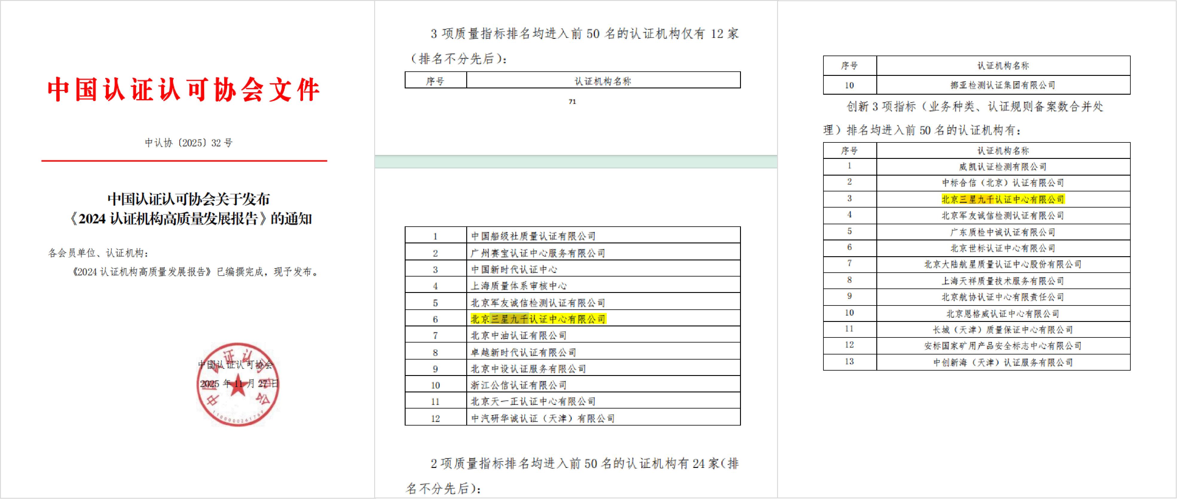 值得关注的是,全国仅有12家机构认证质量3项核心指标全部进入前50名,仅有13家机构创新维度3项指标全部进入前50名,三星九千同时跻身两项名单之中,充分彰显了公司在认证质量管控的严谨性与服务创新的领先性方面已构建起显著的核心竞争力。