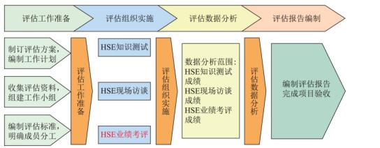 HSE履职能力评估评估流程主要分为评估技术工作准备、评估组织实施、评估数据分析和评估报告编制包括四个阶段。评估技术准备工作,根据领导干部职责和业务风险对领导干部进行分类;细化评估依据和丰富评估手段,同时完成评估方案、评估试题库、访谈主题事项等技术准备工作。HSE履职能力评估实施一般采取绩效评估、现场访谈以及知识与技能测试相结合的方式开展。通过多种方式、多维度的系统评估,真实、准确地评价各位领导干部的HSE履职能力。通过系统地收集和分析绩效、知识和技能测试和现场访谈的结果,发现个人“三强三弱”作为人员任用和能力提升的参考依据,并出具《履职能力评估报告》,报告中明确当前各级领导干部履职能力的现实状况;总结各级领导干部履职能力中普遍存在的短板;为各级领导干部培训需求和培训计划的制定提供依据。