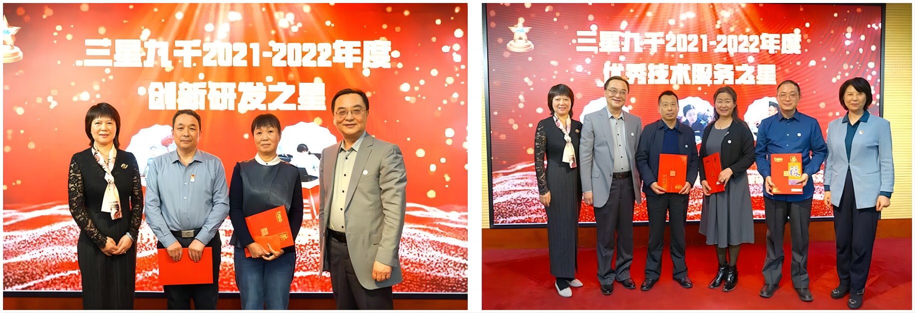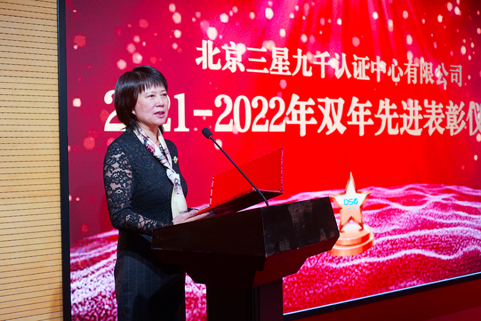 公司副总经理邓虹主持公司2021-2022年双年先进表彰仪式,宣读了颁奖词和表彰名单,同时与公司党支部书记、执行董事王岳虹,总经理马志刚为两年来表现突出的企业文化之星、创新研发之星、技术服务之星、审核服务之星及优秀审核团队、优秀技术服务团队、优秀分支机构颁发了荣誉证书和奖品;为截止2021年公司成立25周年时,在公司专职服务超过15年的人员,颁发了长期贡献奖证书及银质奖章。邓总表示:员工是三星九千最宝贵的资源。三星九千一直坚持以人为本,依靠员工、尊重员工、发展员工,不让人才埋没、不让人才吃亏、让人才在合适的岗位上闪光,以实现企业和员工的共赢。