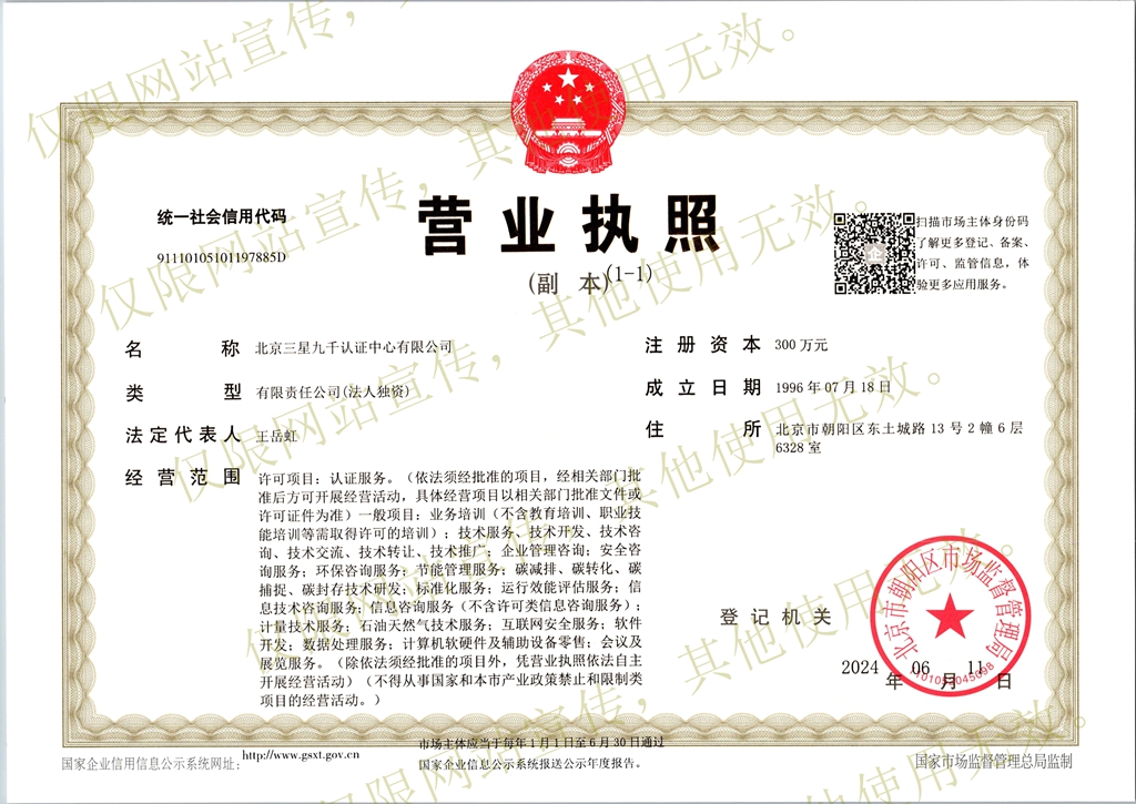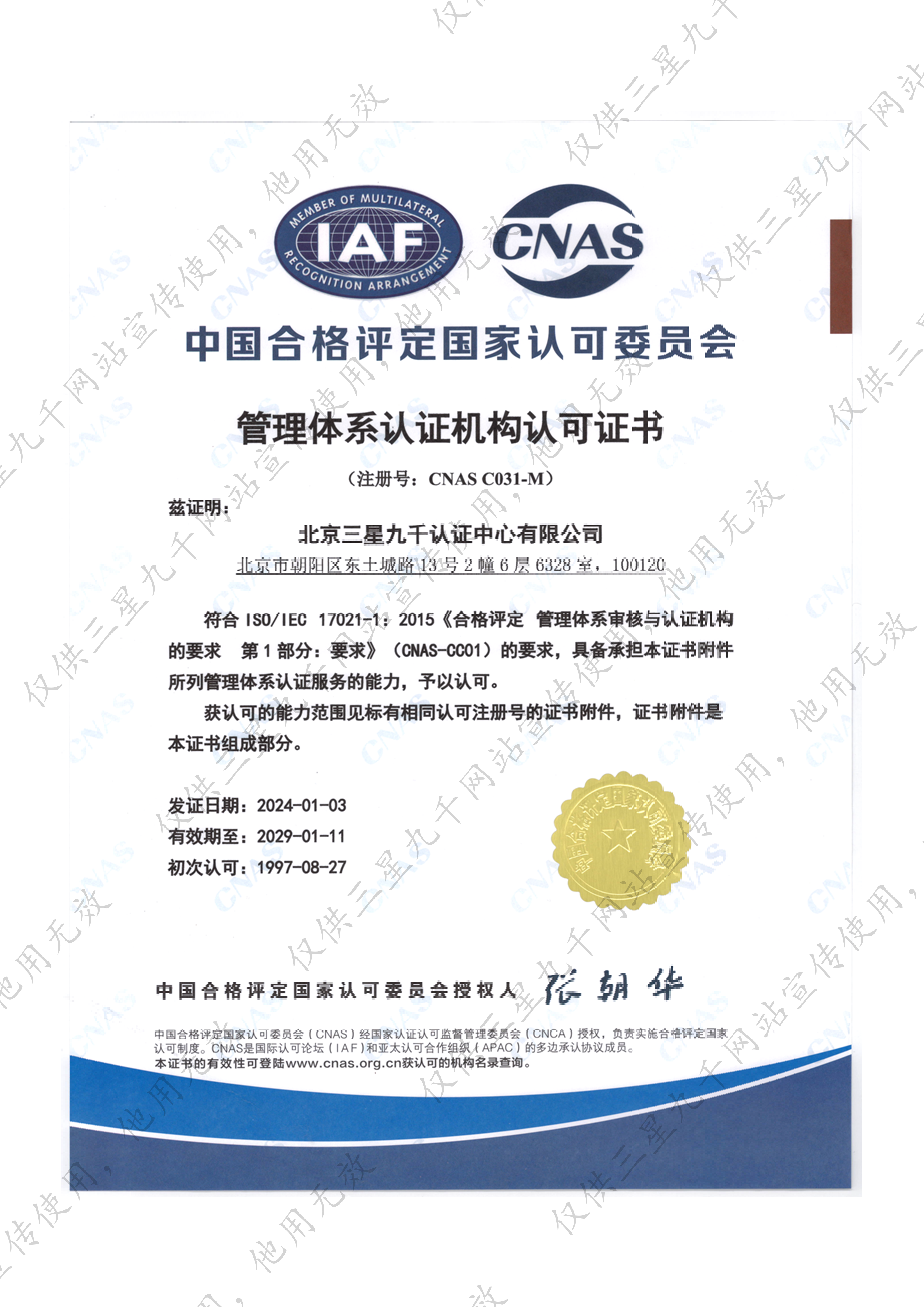 管理体系认证机构认可证书(主证)