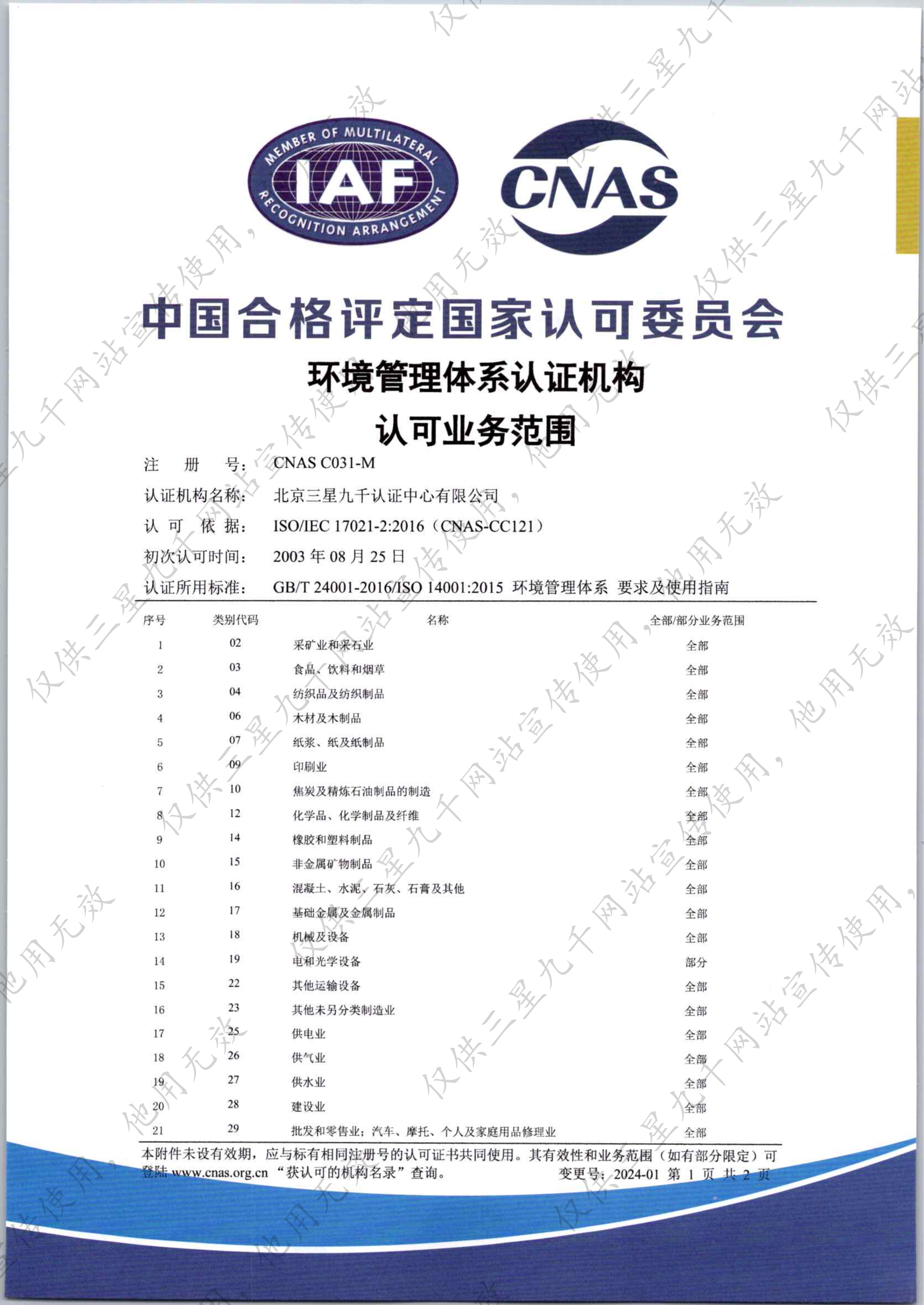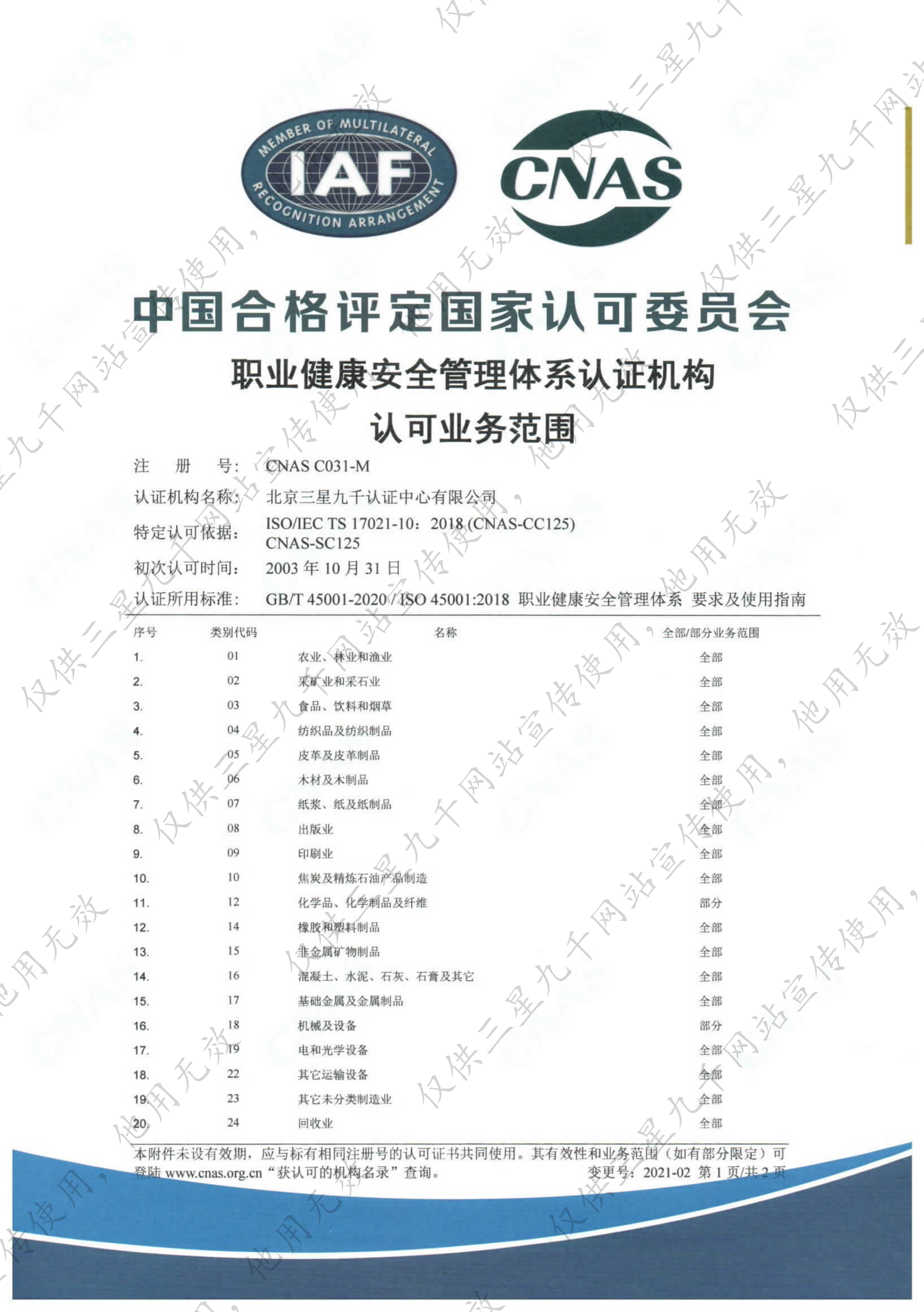 职业健康安全管理体系认证机构认可业务范围证书-1