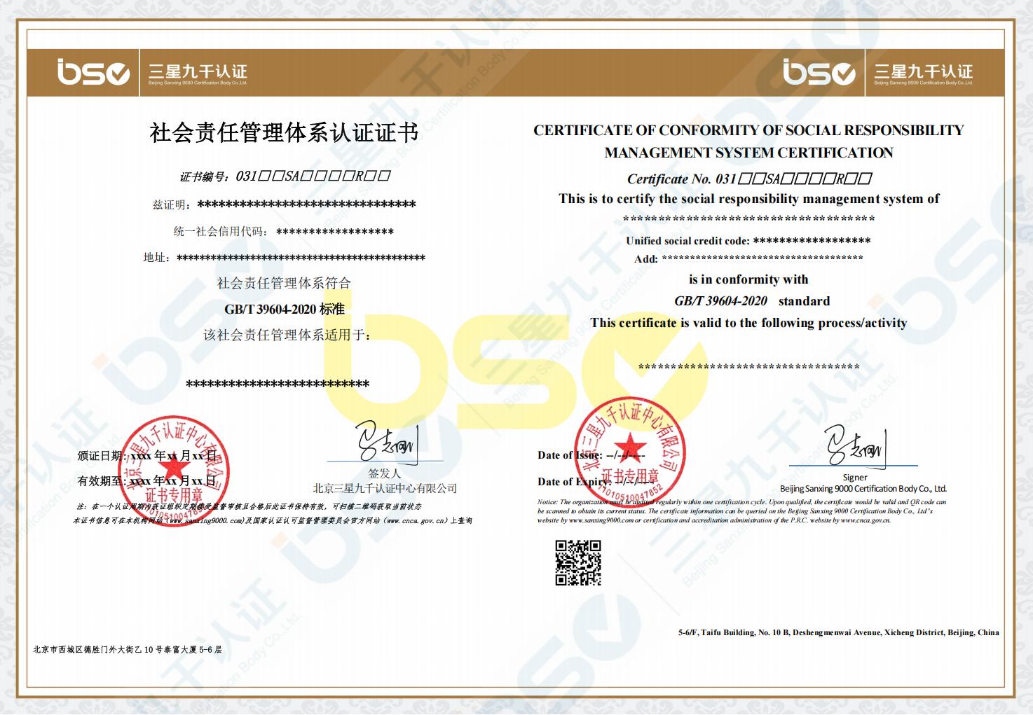 | 社会责任管理体系认证规则 | BSC-03-W-01-SA-2025 | B/0 | 自行制定 | 20250827 | GB/T39604-2020 社会责任管理体系要求及使用指南 | 国家市场监督管理总局、国家标准化管理委员会 | 20201214 | 点击查看 | ||