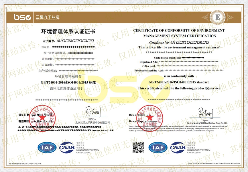 环境管理体系认证证书(样本)