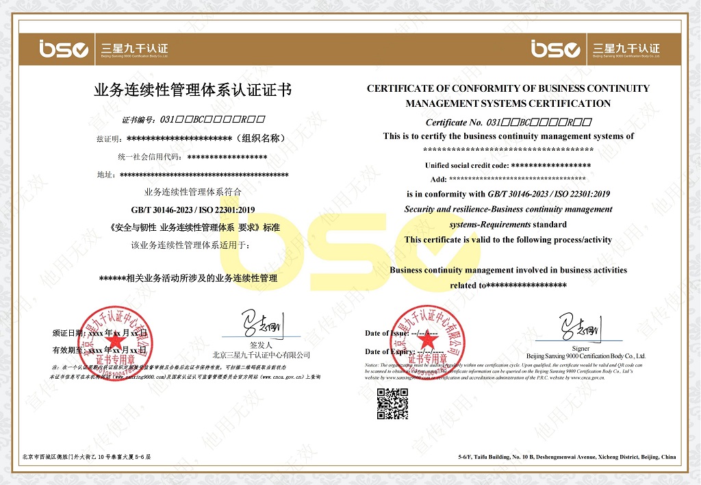 业务连续性管理体系认证证书(样本)