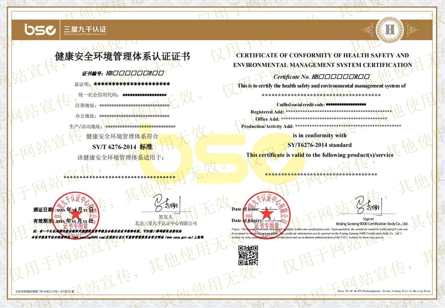 职业健康安全管理体系认证证书(样本)