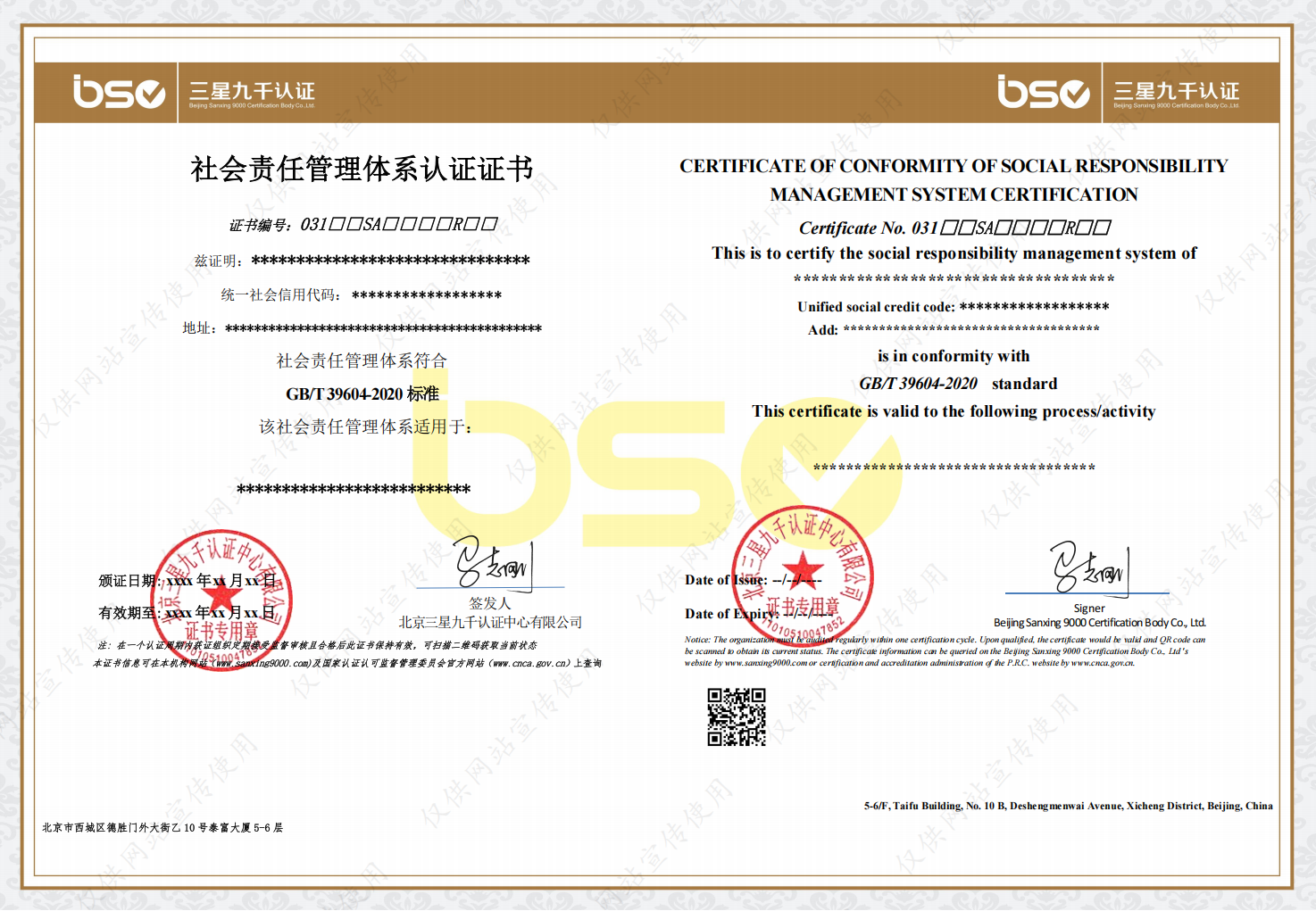 诚信管理体系认证证书(样本)
