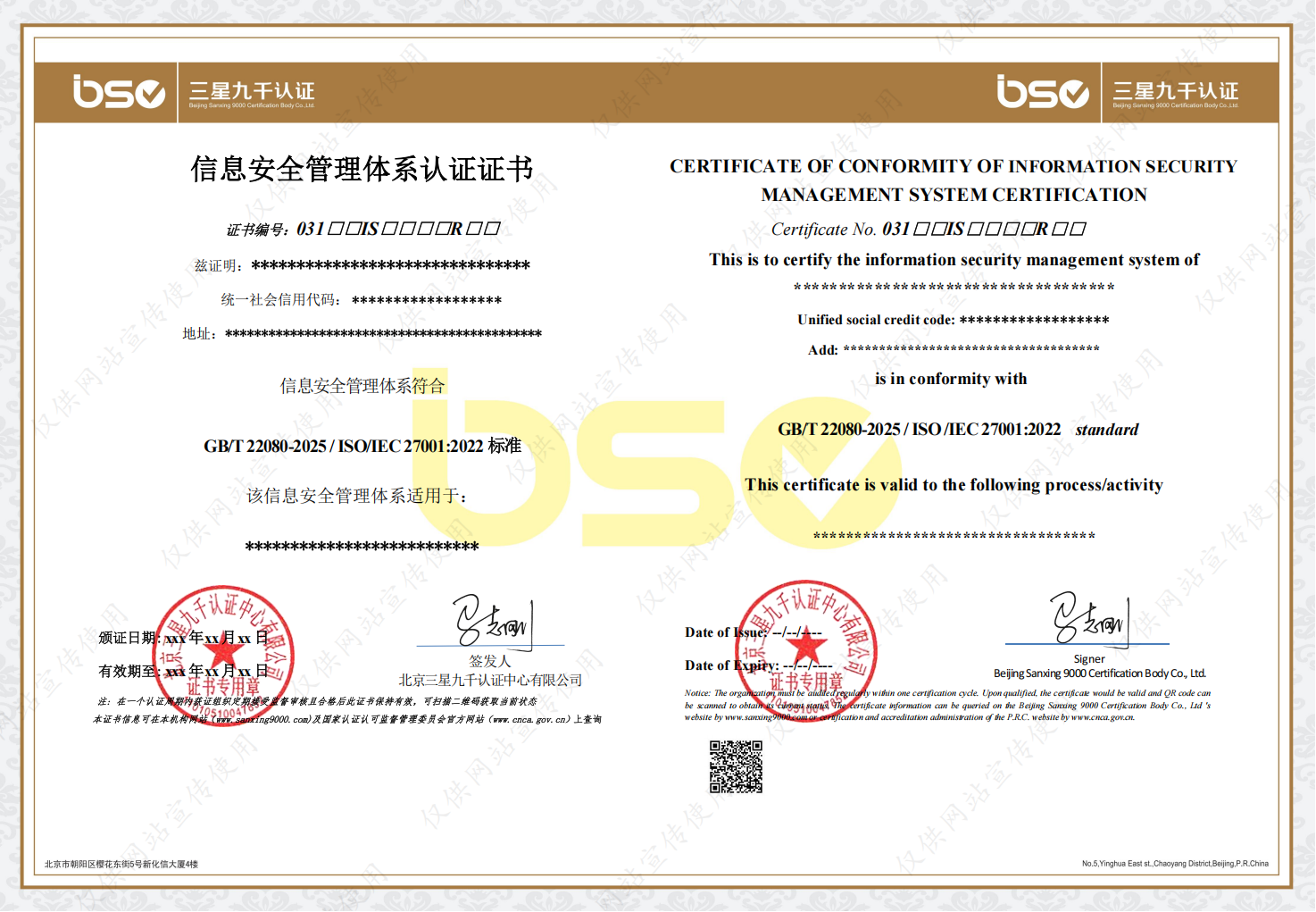 信息安全管理体系认证证书(样本)