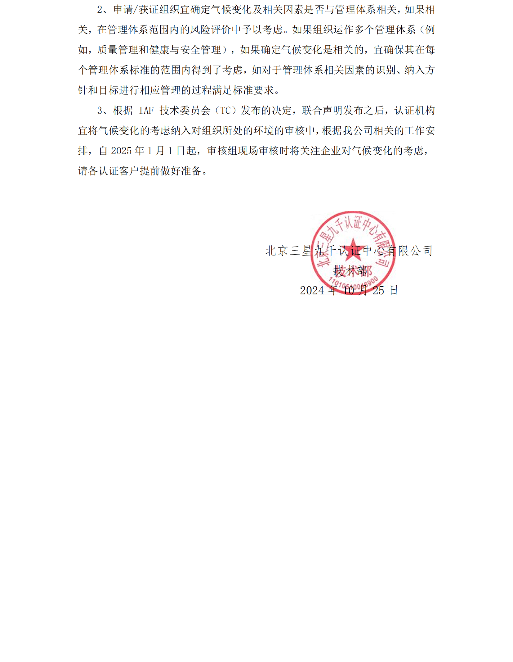 三星九千(技)〔2024〕 07号 关于在管理体系标准中增加气候变化考虑因素相关工作安排的通知