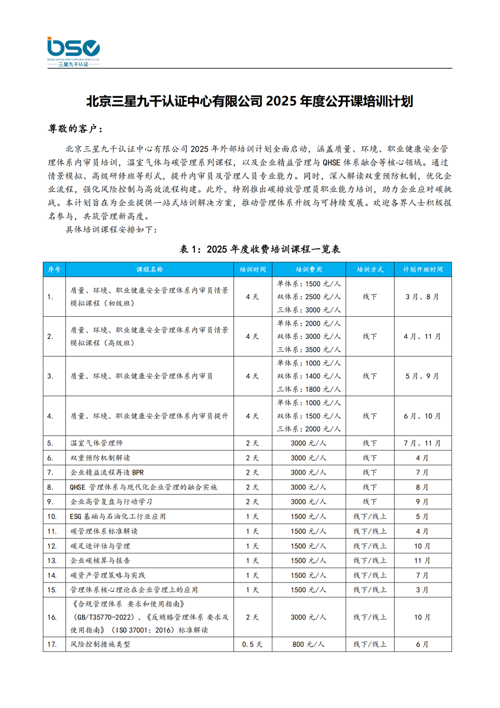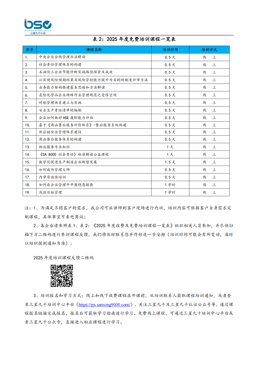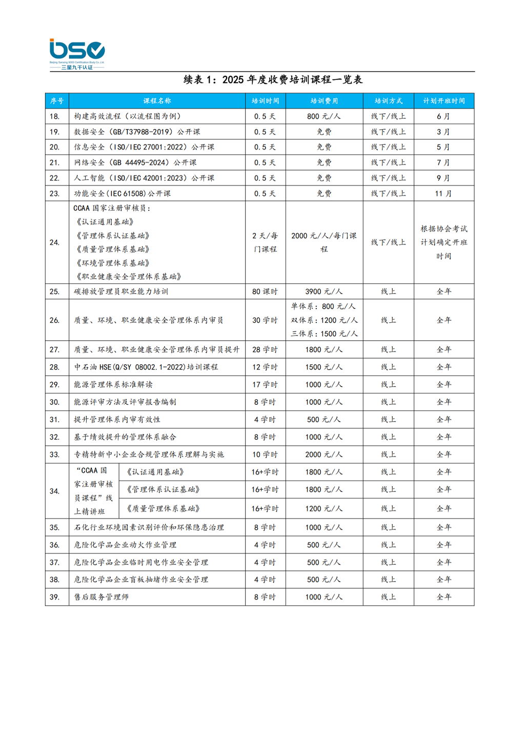 北京三星九千认证中心有限公司2025年度公开课程培训计划
