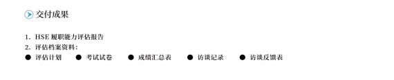 HSE履职能力评估评估流程主要分为评估技术工作准备、评估组织实施、评估数据分析和评估报告编制包括四个阶段。评估技术准备工作,根据领导干部职责和业务风险对领导干部进行分类;细化评估依据和丰富评估手段,同时完成评估方案、评估试题库、访谈主题事项等技术准备工作。HSE履职能力评估实施一般采取绩效评估、现场访谈以及知识与技能测试相结合的方式开展。通过多种方式、多维度的系统评估,真实、准确地评价各位领导干部的HSE履职能力。通过系统地收集和分析绩效、知识和技能测试和现场访谈的结果,发现个人“三强三弱”作为人员任用和能力提升的参考依据,并出具《履职能力评估报告》,报告中明确当前各级领导干部履职能力的现实状况;总结各级领导干部履职能力中普遍存在的短板;为各级领导干部培训需求和培训计划的制定提供依据。