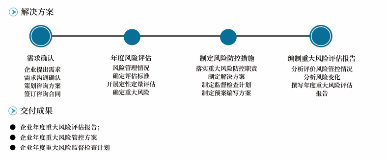 重大风险评估可以帮助企业深度剖析企业发展现状,找出企业在运营管理中存在的薄弱环节,防范化解重大风险;帮助解决企业风险识别、评价过程人员能力不足、技术方法不专业等问题,确保风险识别评价结果的准确性、应对措施的科学性,提高企业风险管控能力;为企业战略制定和调整、投资决策和财务预算等提供准确、科学的基础输入。