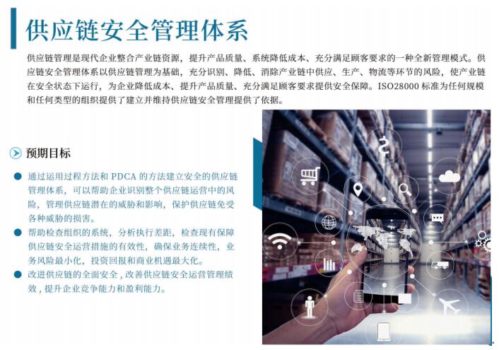 供应链管理是现代企业整合产业链资源,提升产品质量、系统降低成本、充分满足顾客要求的一种全新管理模式。供应链安全管理体系已供应链管理为基础,充分识别、减低、消除供应链中供应、生产、物流等环节的风险,是产业链在安全状态下运行,为企业降低成本、提升产品质量、充分满足顾客要求提供安全保障。ISO 28000标准为任何规模和任何类型的组织提供了建立并维持供应链安全管理提供了依据。